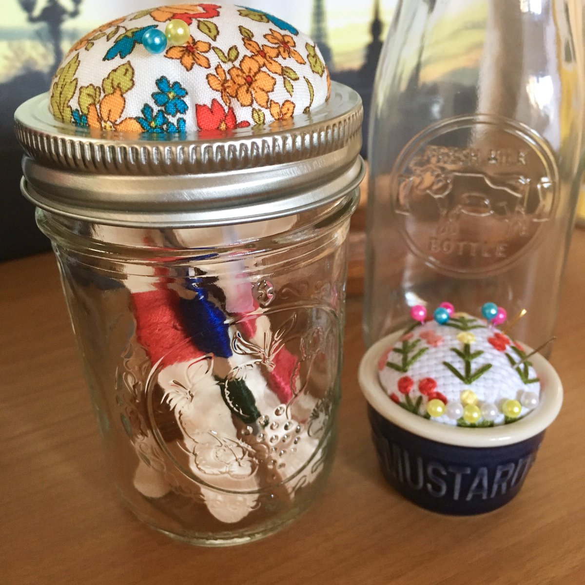 にちようび もち太郎さんに教えていただいた メイソンジャーのピンクッションが出来上がったー 布くっつけただけだけど可愛い 奥の瓶はキャンドゥで買ったミルク瓶